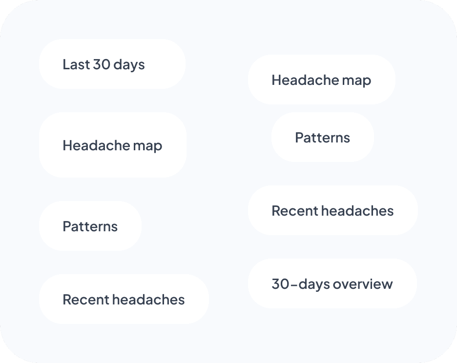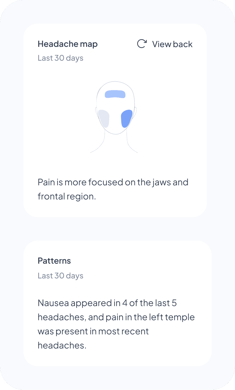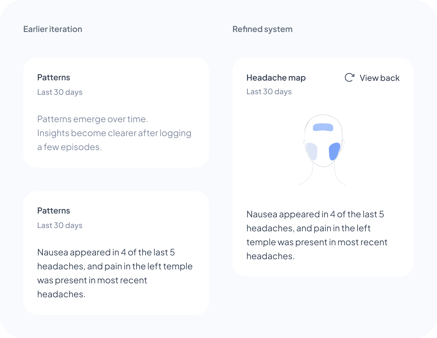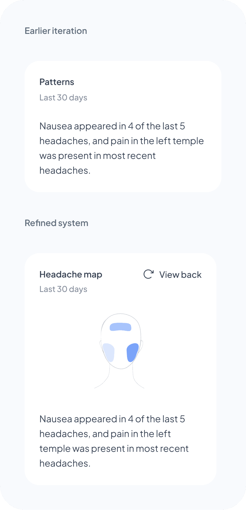 I tested placing patterns inside the headache map card, but it felt too heavy. I moved them into their own card instead, without a “Patterns” label, which I intentionally avoided to reduce cognitive load.