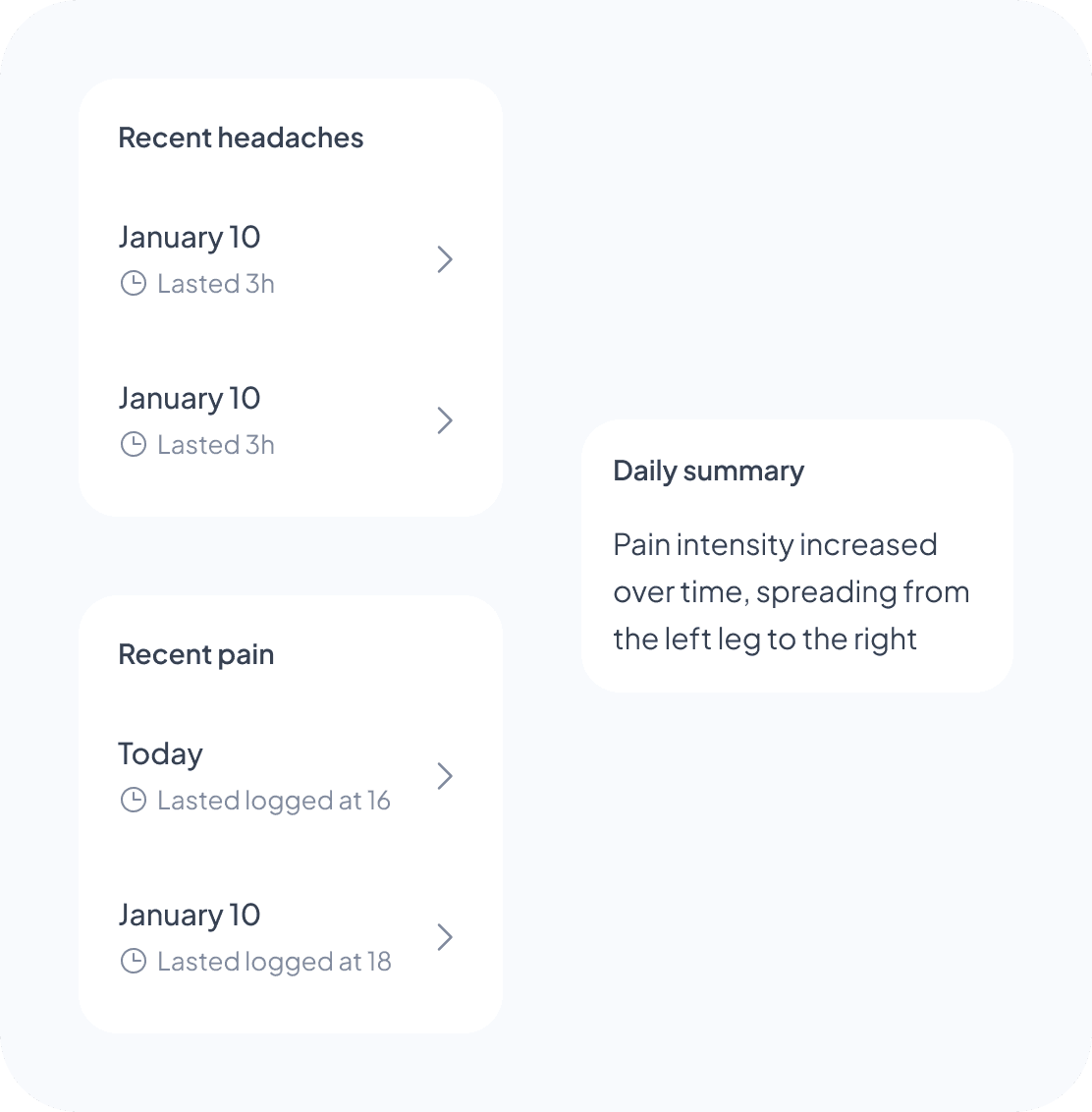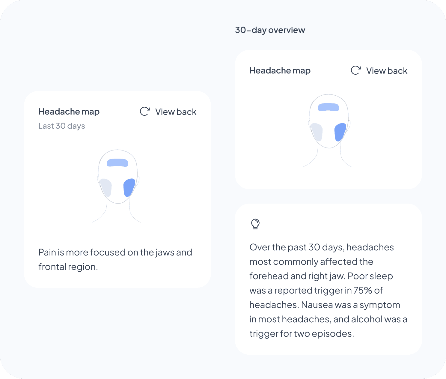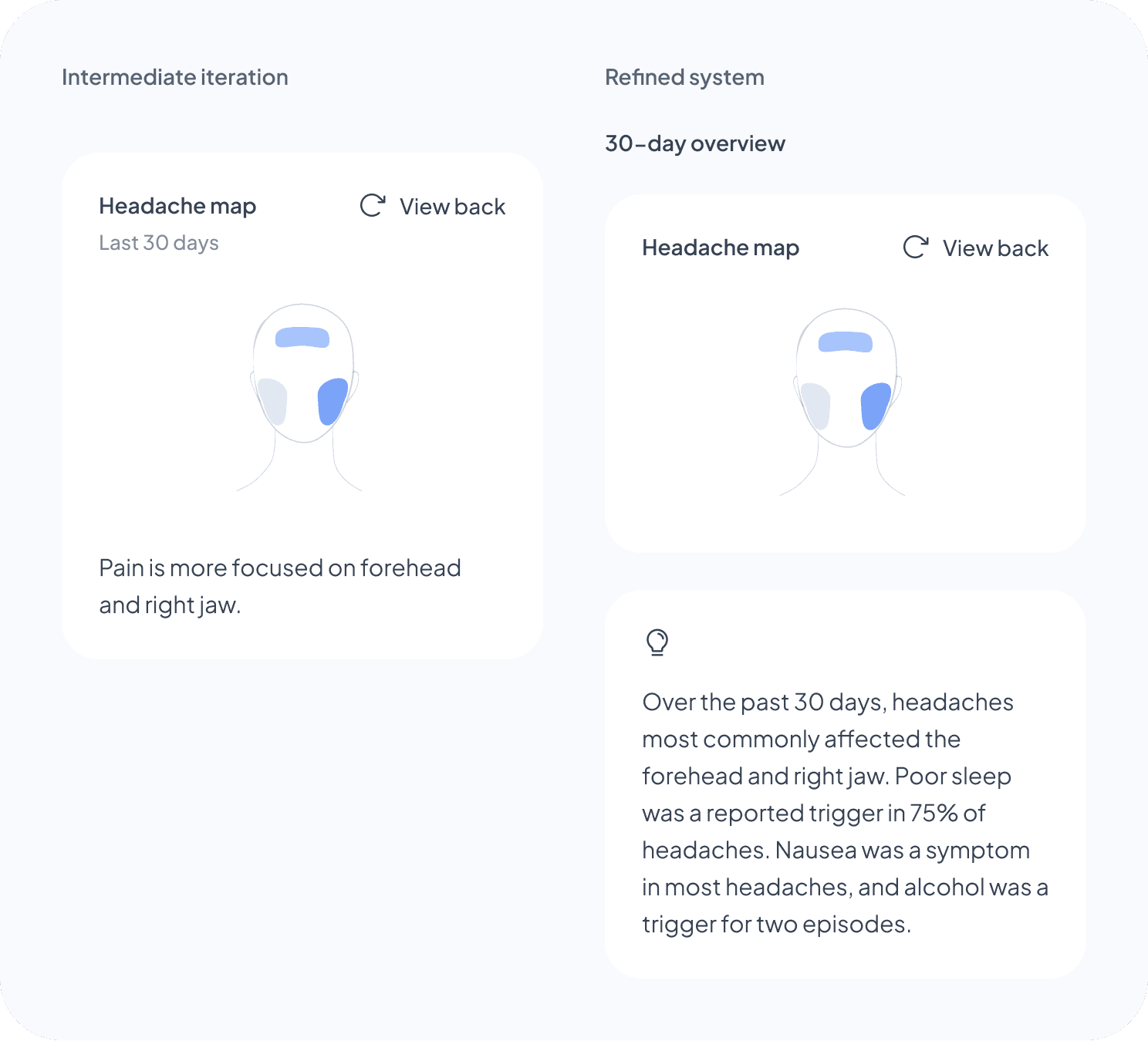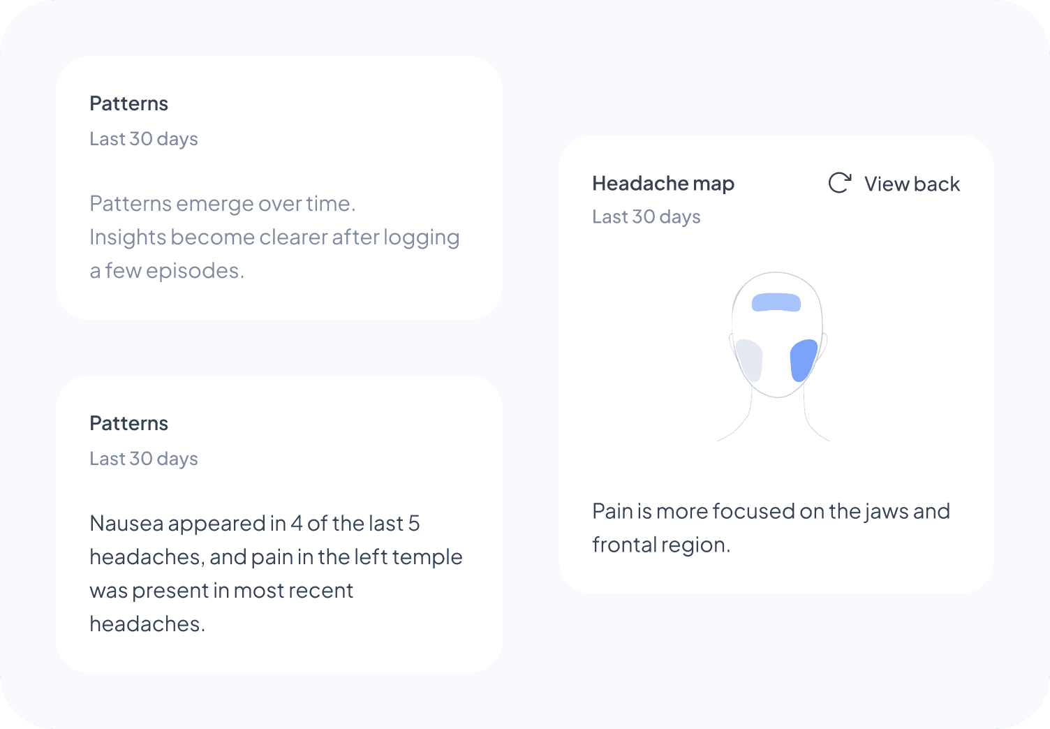 I tested placing patterns inside the headache map card, but it felt too heavy. I moved them into their own card instead, without a “Patterns” label, which I intentionally avoided to reduce cognitive load.
