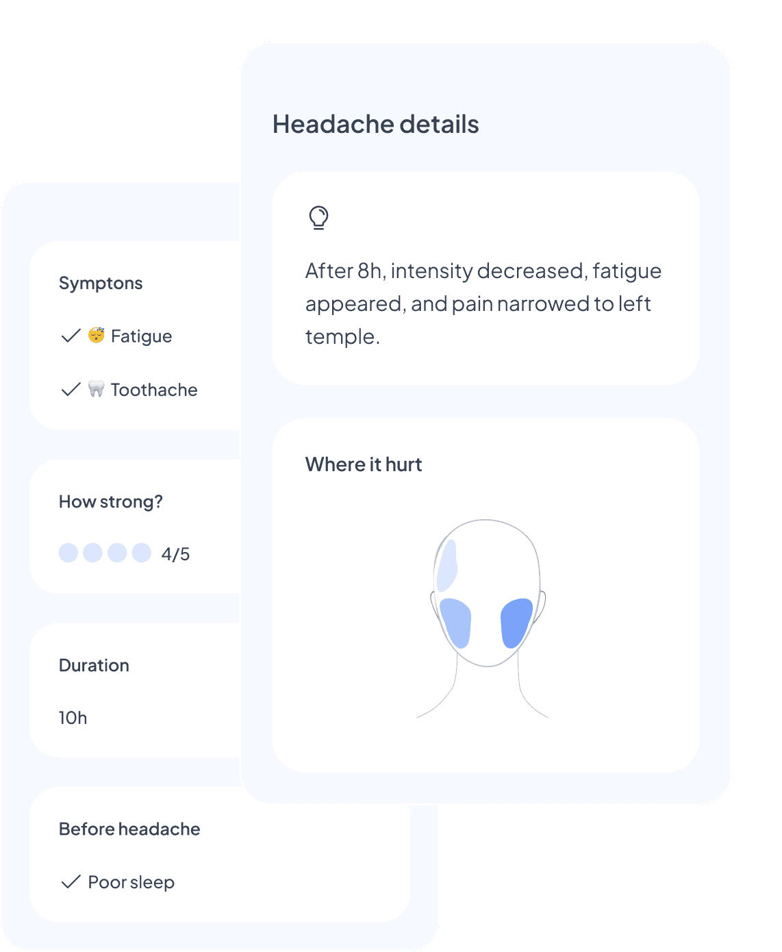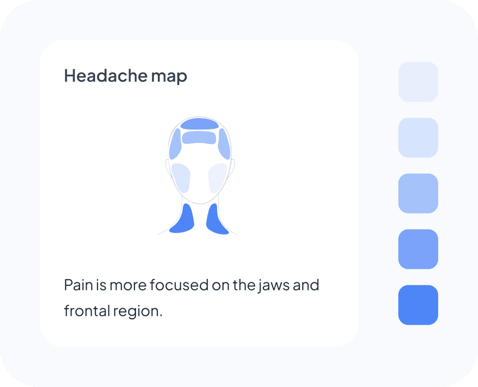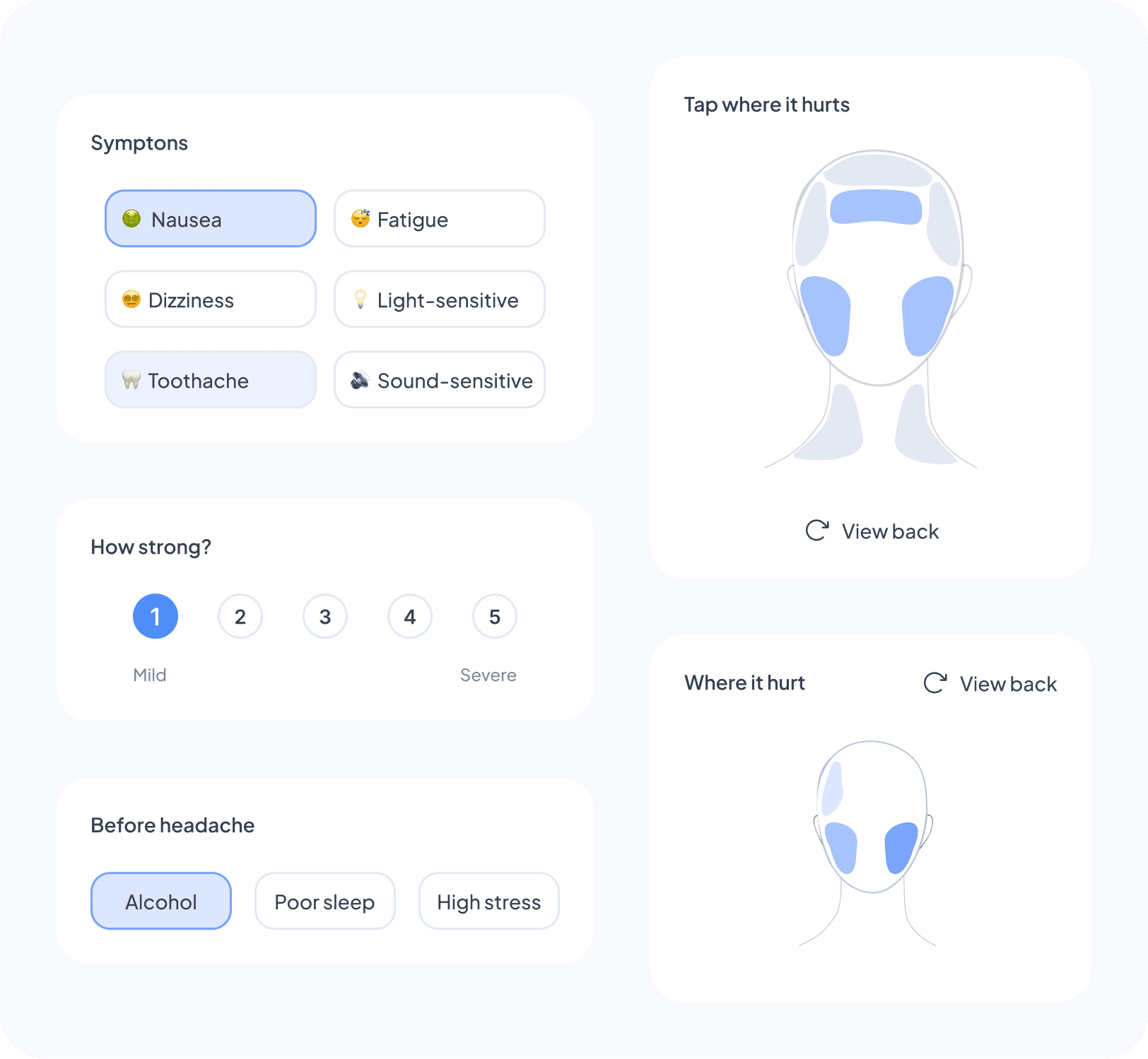 For headaches, a head map allows multiple areas to be selected, supporting realities like spreading or bilateral pain.
