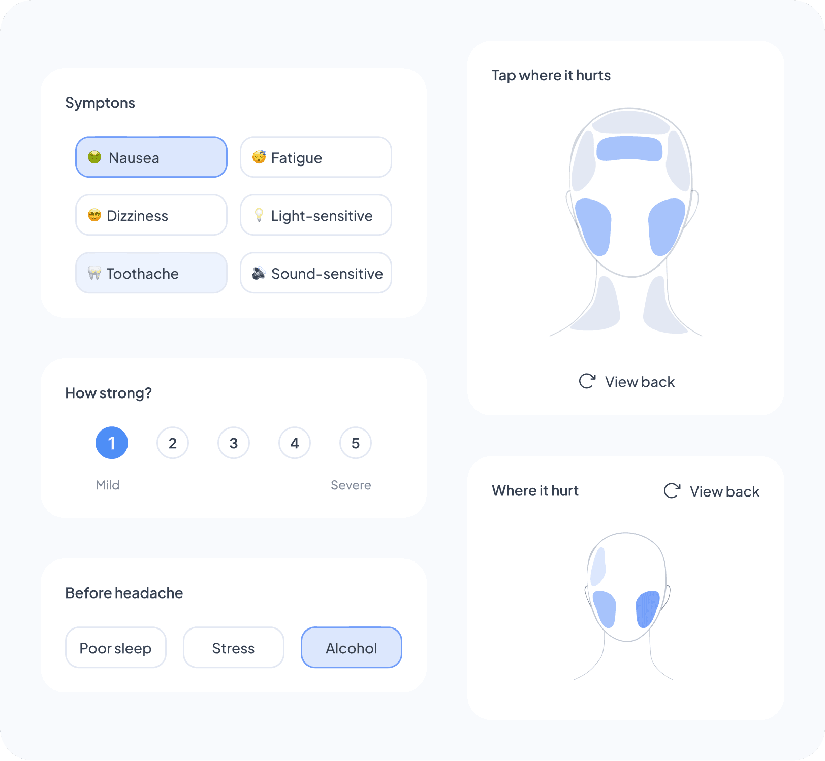 For headaches, a map allows multiple areas to be selected, supporting realities like spreading or bilateral pain.