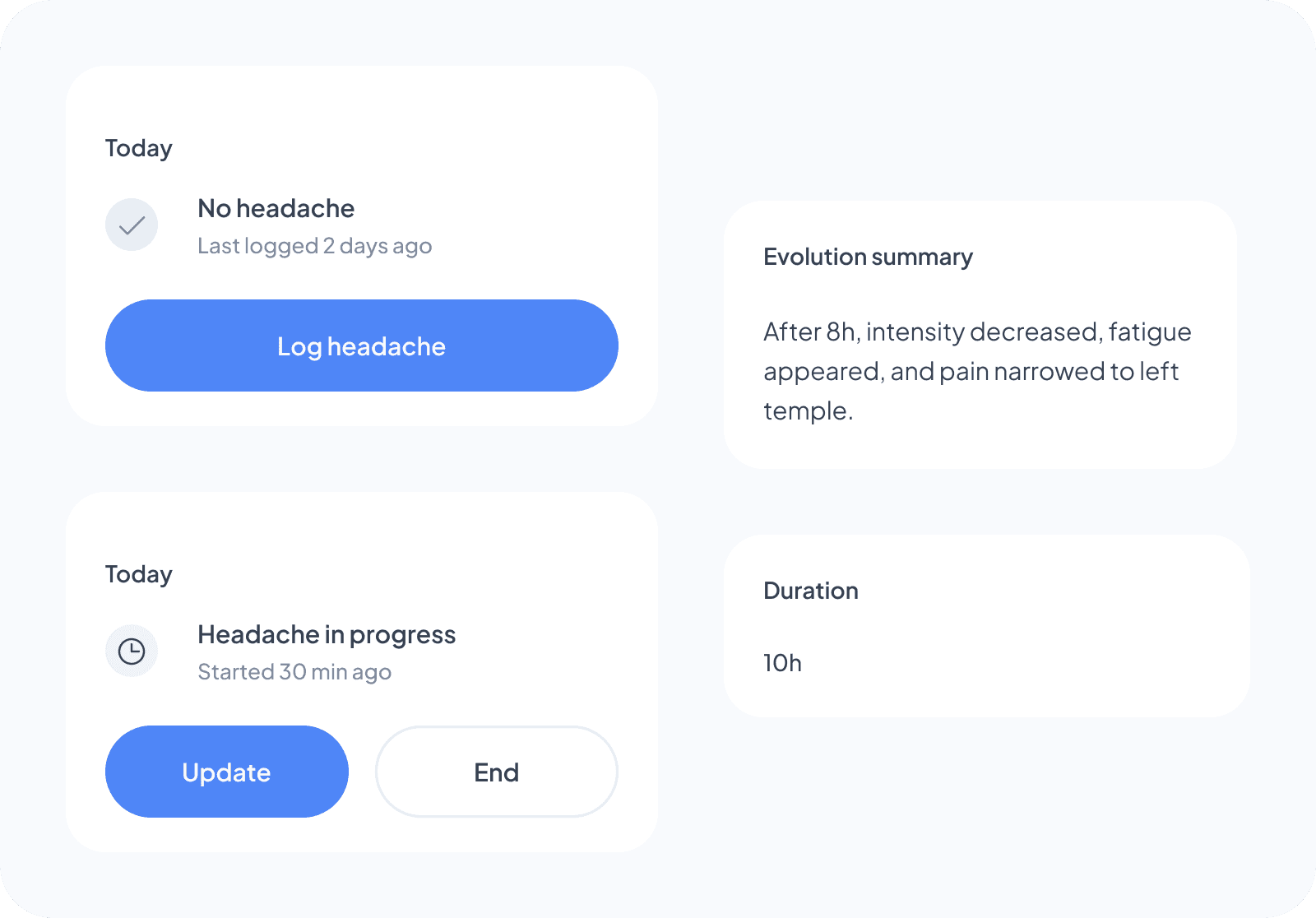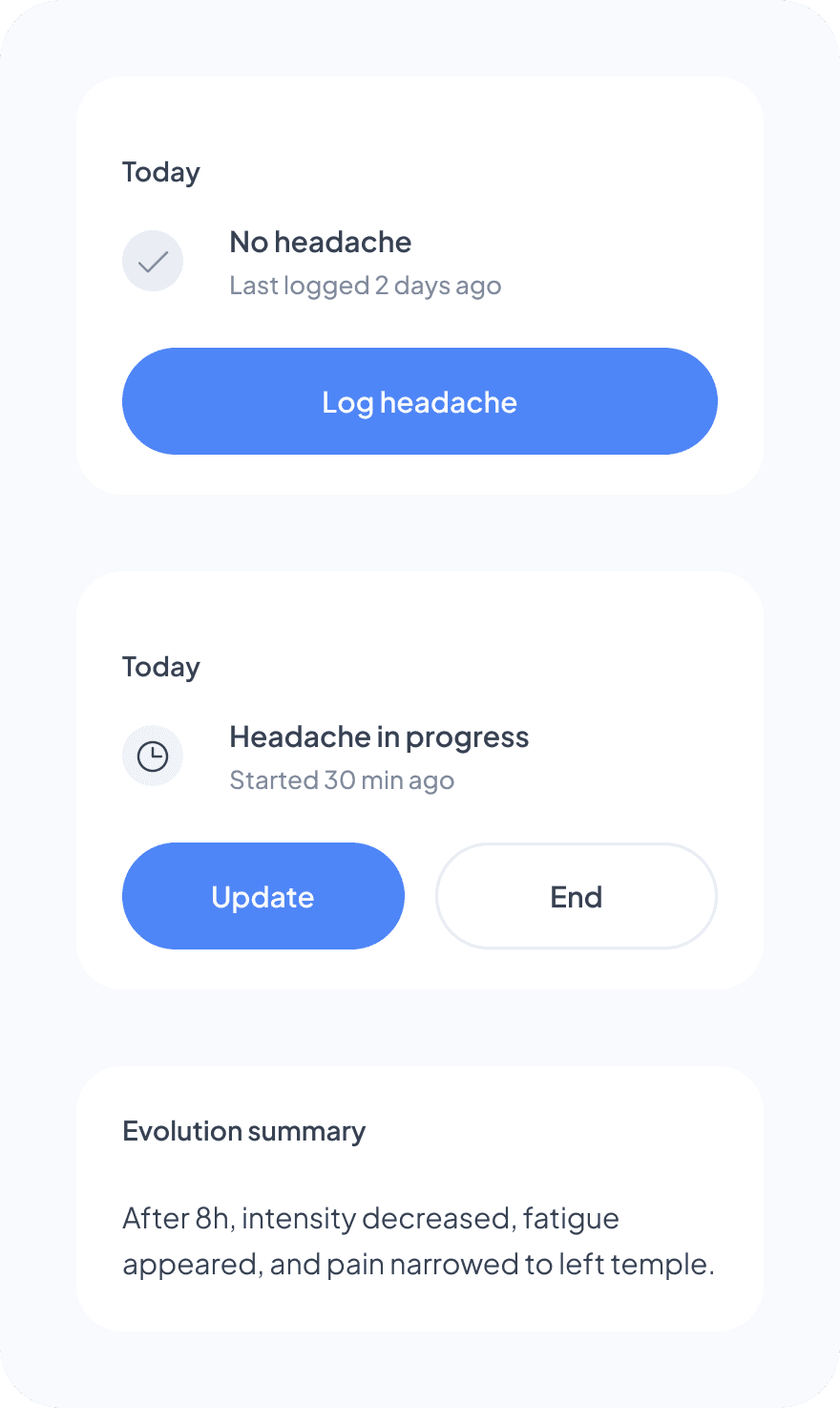 A headache can evolve over time. That’s why headaches have two states: no headache and in progress. Each update during an active episode creates a snapshot of the state, including intensity, symptoms, location, and context.